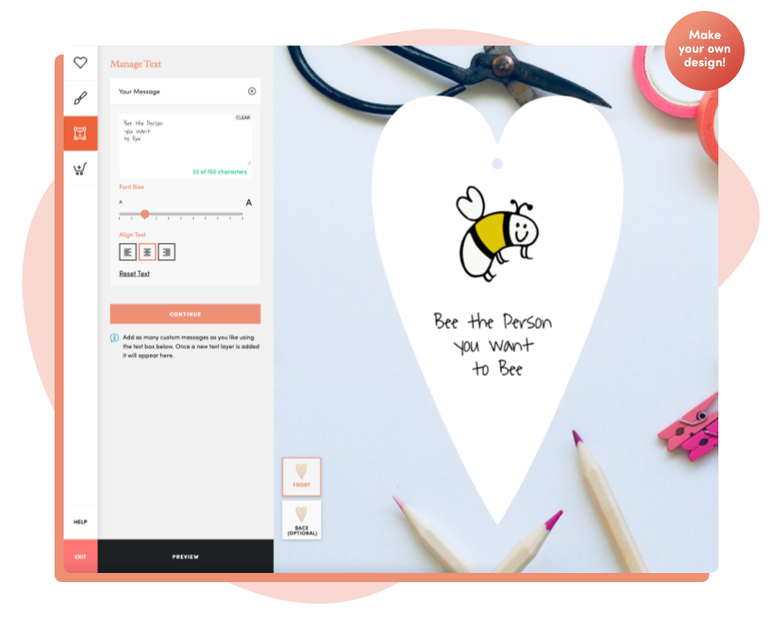 That’s right, now you can design your very own personalised gift using a selection of our unique artwork! Write your own message, place the artwork, pick the bow and then we’ll make it