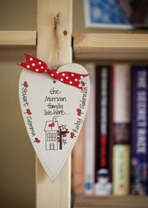 This handwritten heart makes a lovely gift for a special family. Painted in a soft off-white, this heart features the family surname, first names and hand drawn shaker style house. Pets' names can be added to the front and your own message onto the back at no extra cost to make a truly unique keepsake.£8.00 View Product - Heart & Home